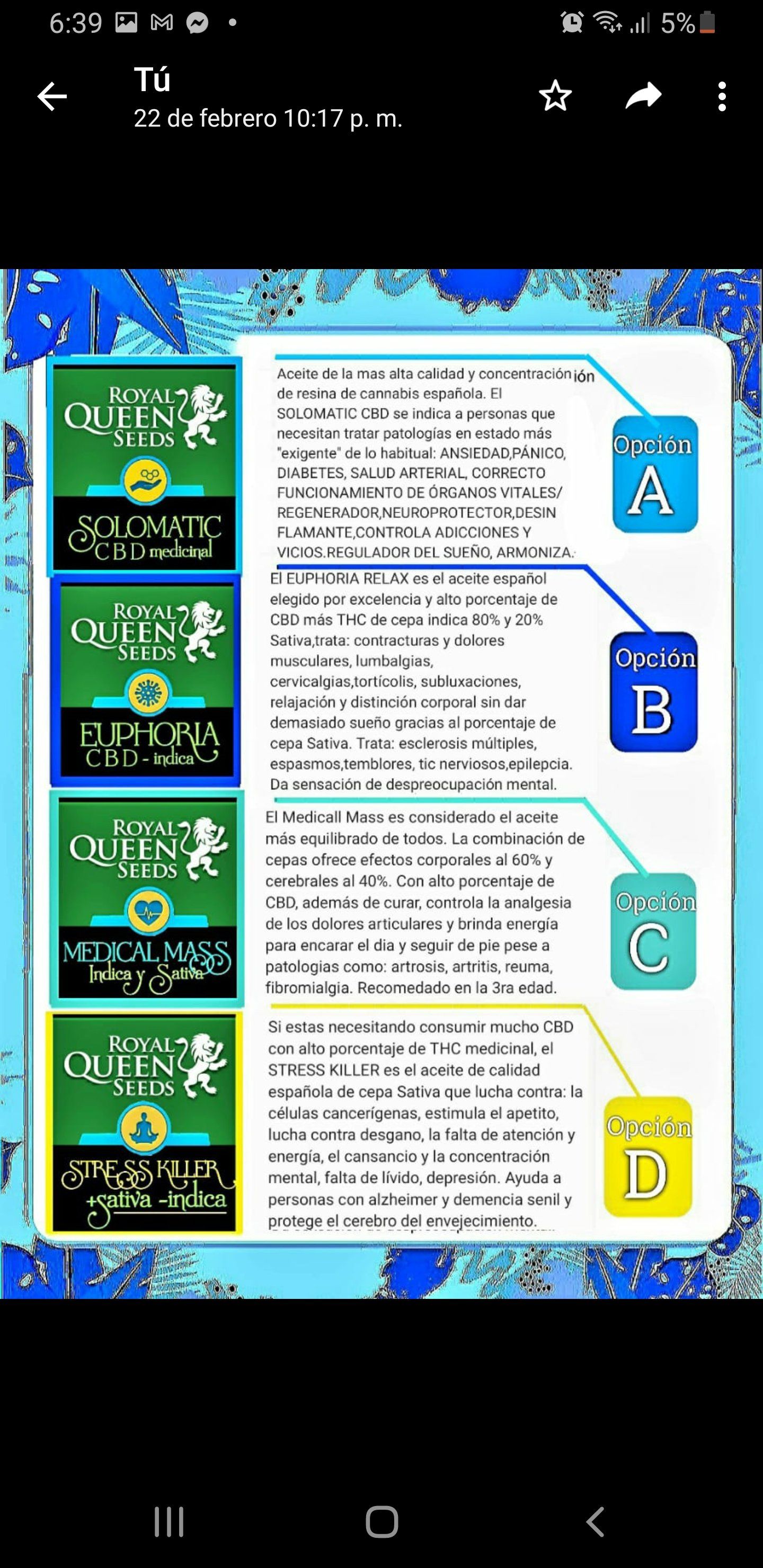 B) Aceite medicinales de cannabis (de calidad importada) segunda línea: Royal Queen Satindica S.A.